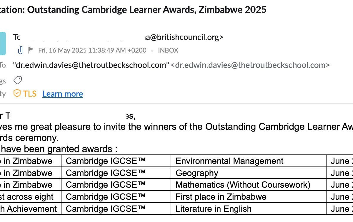 Press Release: 16 August 2024 The Troutbeck School is proud to announce our June results: Enrolling Primary and ECD through to Cambridge IGCSE. Whatsapp us now on +263718811855 (Dr Edwin) or +263719811855 (Dr Grace).