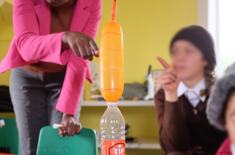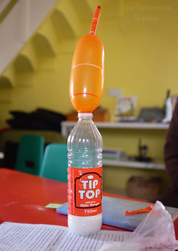 Learning about chemical reactions in classroom chemistry: Here the team is blowing up a balloon with carbon dioxide (CO2) made by mixing vinegar and bicarbonate of soda!