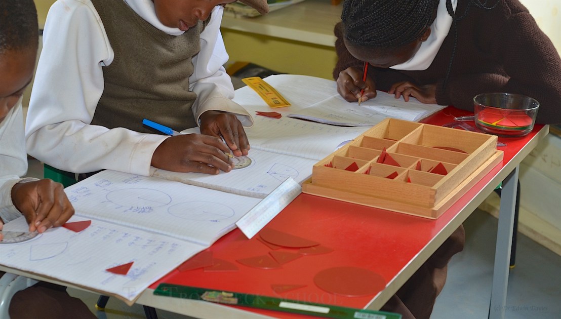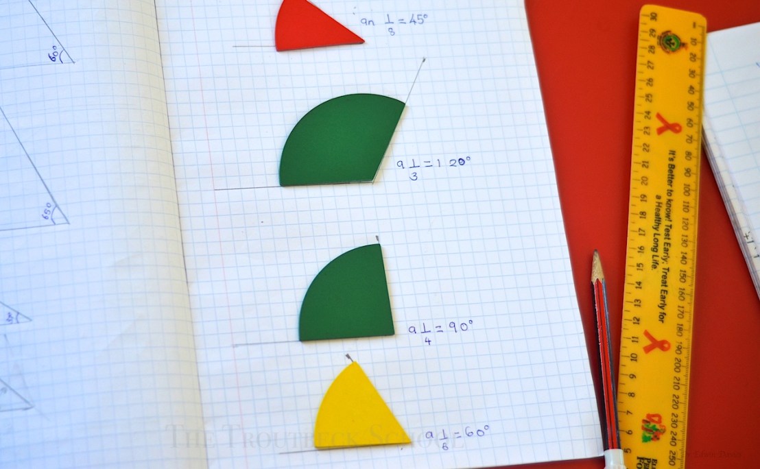 This term in Geometry we started using our protractors and discovered that our Montessori fraction pieces can be drawn as angles: