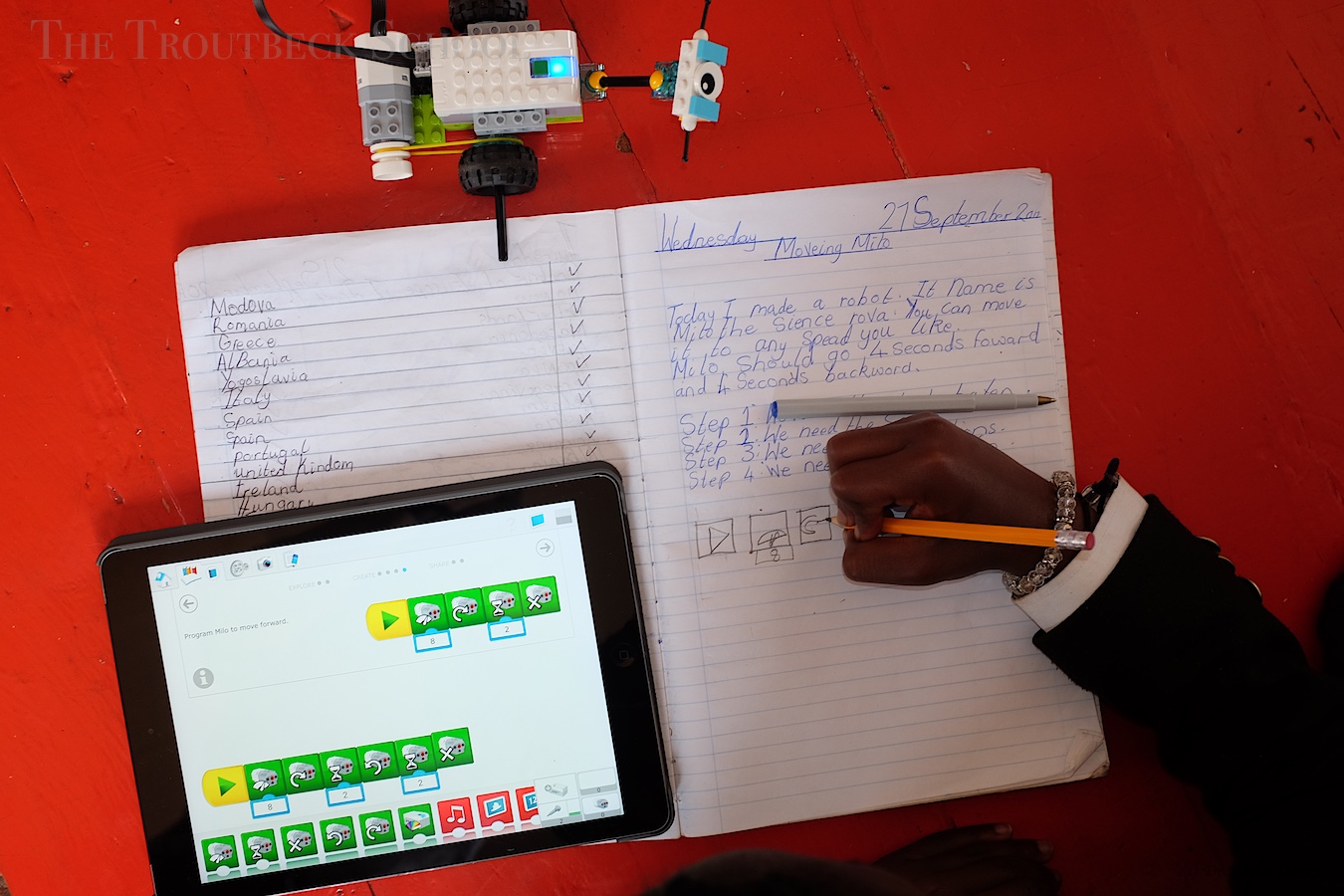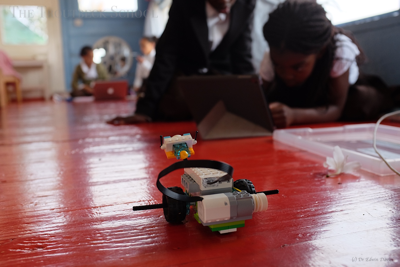 Here the girls build a motorised robot capable of receiving forward, reverse, motor speed and on-duration instructions provided remotely from the code they will assemble on the iPad.